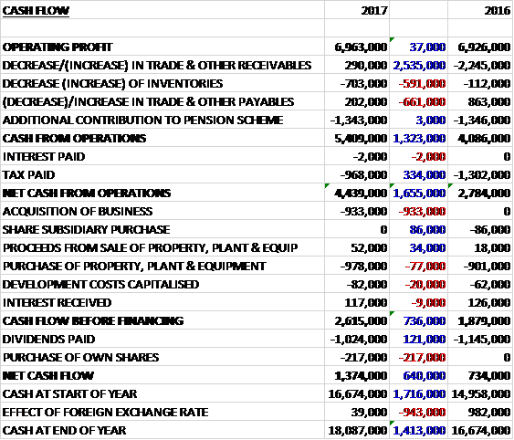 Before movements in working capital, cash profits were broadly flat at £7M. There was a cash outflow from working capital but this was less than last year and after tax payments were up £334K the net cash from operations was £4.4M, a growth of £1.7M year on year. The group spent £933K on an acquisition and £978K on capex to give a free cash flow of £2.6M. This easily covered the dividends of £1M and there was a positive cash flow of £1.4M for the year and a cash level of £18.1M at the year-end.