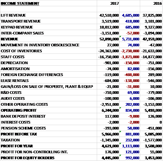 Revenues increased when compared to last year due to a £4.7M growth in lift revenue, a £685K increase in keypad revenue and a £418K growth in transport revenue. Cost of inventories increased by £2.7M, staff costs were up £1.9M and there was a £408K detrimental movement in forex but the operating profit remained £834K higher. There was a small fall in the cost of the pension scheme and tax charges reduced by £232K to give a profit for the year of £4.4M, a growth of £992K year on year.