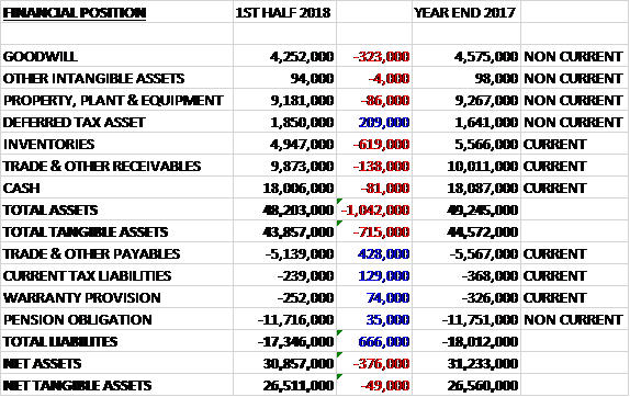 When compared to the end point of last year, total assets declined by £1M, driven by a £619K fall in inventories, a £323K decrease in goodwill and a £138K decline in receivables, partially offset by a £209K growth in deferred tax assets. Total liabilities also declined during the period due to a £428K decrease in payables and a £129K fall in current tax liabilities. The end result was a net tangible asset level of £26.5M, broadly flat over the past six months.