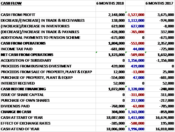 Before movements in working capital, cash profits declined by £1.5M to £2.1M. There was a cash outflow from working capital and the pension scheme payments but the working capital movements were more favourable than last year and after tax payments reduced by £44K the net cash from operations was £1.1M, a decline of £509K year on year. The group brought in £439K from a business divestment and spent a net £542K on capex to give a free cash flow of £1.1M. Of this, £768K was spent on dividends to give a cash flow of £304K and a cash level of £18M at the period-end.