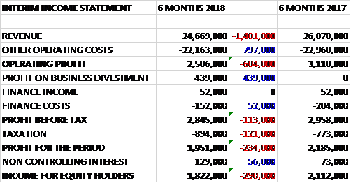 Revenue declined by £1.4M and operating costs fell by £797K which meant that the operating profit was £604K lower. There was a £439K profit on a business sale and finance costs declined by £52K but tax charges grew by £121K to give a profit for the period of £1.8M, a decline of £290K year on year.