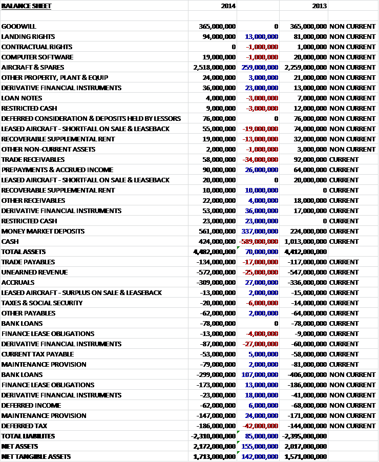 When compared to the end point of last year, total assets increased by £4.482BN driven by a £259M increase in aircraft and spares, a £337M growth in money market deposits and a £59M increase in derivative financial instruments, partially offset by a £589M fall in cash levels, and a £34M decline in trade receivables. Liabilities fell during the year as a £42M increase in deferred tax and a £25M growth in unearned revenue, which represents the seats sold but not yet flown, was more than offset by a £107M fall in bank loans, a £27M decline in accruals and a £26M fall in the maintenance provisions. The end result was a decent £142M increase in net tangible assets to £1.713BN which seems like a strong balance sheet to me. There were some £466M of operating leases outstanding, mostly relating to aircraft.