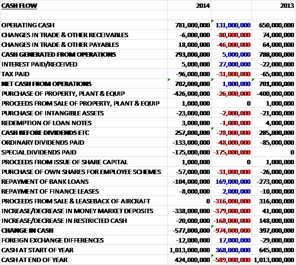 Before movements in working capital, cash profits increased by £131M to £781M. The favourable movements last year in payables and receivables were then partially offset and a reduction in interest paid was counteracted by an increase in tax so that net cash from operations increased by just £1M to £702M. This covered the capital expenditure of nine new aircraft, parts used in engine restoration and pre-delivery costs on 35 aircraft ordered during the year along with £20M for the acquisition of Gatwick landing rights from FlyBe, fairly comfortably to give a free cash flow of £257M. The group used this to pay off some loans and bank leases with the rest going on ordinary dividends before they dipped into their reserves to pay a £175M special dividend and put some £338M into money market deposits to leave a cash outflow of £577M and a cash level at the year-end of £424M.