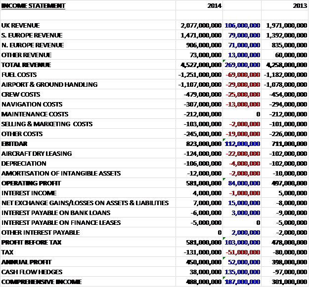 Easy Jet is a short haul European low cost airline. As well as the main brand, they also own 49% of EasyJet Switzerland. The company pays some £12.6M in order to use the Easy Jet brand. It has now released its final results for the year ending 2014.