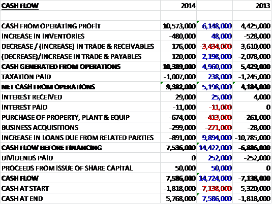 Before movements in working capital, cash profits increased by £6.1M to £10.6M. The increase in inventories was broadly offset by beneficial movements in payables and receivables and after the tax was paid, the net cash from operations was £9.4M, an increase of £5.2M year on year. There was not that much in the way of capital expenditure with £674K spent on fixed assets and £299K spent on acquisitions. After a £900K increase in loans due from related parties, the cash flow for the year stood at an impressive £7.6M to give a cash level at the year-end of £5.8M