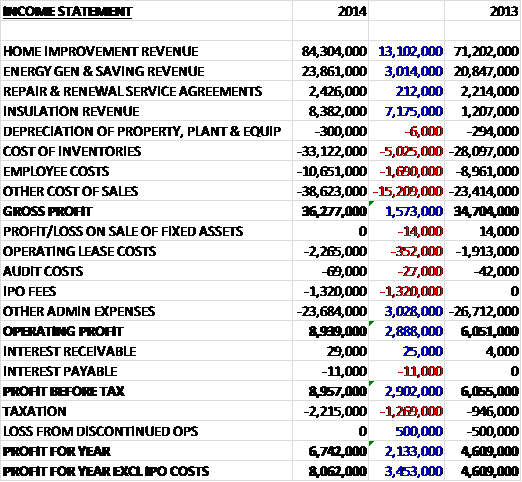 When compared to last year, revenues increased considerably with a £13.1M increase in home improvement revenue, a £3M growth in energy saving revenue and a huge £7.2M increase in insulation revenue from nearly a standing start. We then see cost of inventories up £5M, employee costs up £1.7M and other cost of sales up £15.2M which gives a gross profit some £1.6M higher than in 2013. There was a £352K growth in operating costs but a decline in other underlying admin expenses, partially offset by a £1.3M IPO charge to give an operating profit ahead by £2.9M higher and after a £1.3M growth in tax, the profit for the year stood at £6.7M, an increase of £2.1M year on year.