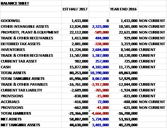 When compared to the end point of last year, total assets increased by £10.4M driven by a £4.1M growth in cash, a £2.7M increase in inventories, a £2.3M growth in intangible assets mostly due to the change in accounting estimates for amortisation, and a £1.4M increase in receivables. Total liabilities also increased during the period due to a £3.9M growth in payables and a £765K increase in current tax liabilities. This all meant that there was a net tangible asset level of £44.6M, a growth of £3.4M over the past six months.