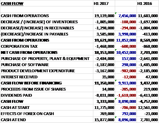 Before movements in working capital, cash profits increased by £7.5M to £19.1M. There was a small cash inflow from working capital compared to an outflow last time and after tax payments increased by £600K the net cash from operations was £18.2M, a growth of £10.5M year on year. The group spent £2.5M on fixed tangible assets, £1.2M on software and £3.2M on product development to give a free cash flow of £11.4M. This easily covered the £8M paid out in dividends to give a cash flow of £3.3M and a cash level of £15.9M at the period-end.