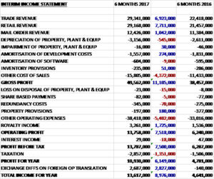 Revenues increased when compared to the first half of last year due to a £7.7M growth in retail revenue, a £6.9M increase in trade revenue and a £1M growth in mail order revenue. Amortisation declined by £265K but depreciation was up £545K and other cost of sales grew by £4.4M to give a gross profit £11.1M above that of last time. Other operating expenses grew by £5.3M but the royalty income increased by £1.7M to give an operating profit £7.5M ahead. After tax charges increased by £1.4M the profit for the period came in at £10.9M, a growth of £6.1M year on year although £644K of this was due to a change in accounting estimates.