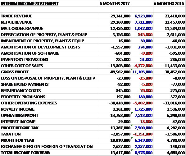 The operating profit in the mail order division was £6.7M, an increase of £420K when compared to the first half of 2016. The Made to Order and Last Chance to Buy web store initiatives, aimed at ensuring customers have access to the broader range, have performed well.