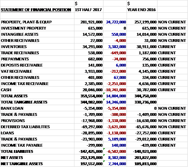 When compared to the end point of last year, total assets increased by $14.8M driven by a $24.7M increase in property, plant and equipment along with a $3.4M growth in inventories, partially offset by a $10.7M decrease in cash and a $2.3M fall in income tax receivables. Total liabilities also increased during the period as a $5.1M decrease in payables was more than offset by a $6.5M growth in loans, a $3.6M increase in deferred tax liabilities and a $1.3M growth in provisions. The end result was a net tangible asset level of $197.6M, a growth of $7.7M over the past six months.