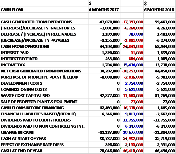 Before movements in working capital, cash profits declined by $17.4M to $42.1M. There was a cash outflow from working capital, mainly due to a decrease in payables, but tax payments reduced by $15.4M to give a net cash from operations of $34.2M, a decline of $10.3M year on year. The group spent $8.8M on property, plant and equipment, mostly relating to the mining support services complex construction, along with $42.9M on waste costs which meant that there was a cash outflow of $17.5M before financing. They raised $6.3M through finance leases to give a cash flow of $11.1M and a cash level of $20M at the period-end.