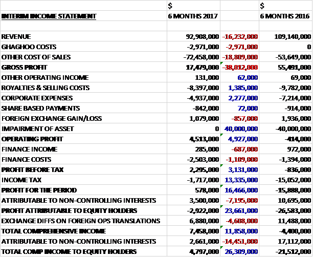 Revenues declined by $16.2M when compared to the first half of last year. We also see one-off Ghagoo costs of $3M and other cost of sales increase by $18.8M, mainly relating to an increase in waste stripping amortisation costs due to the mining mix, to give a gross profit $38M lower. Royalties and selling costs declined by $1.4M and corporate expenses were down $2.3M, however. We also see no asset impairments, which cost $40M last time so the operating profit increased by $4.9M. Finance costs grew by $1.1M and finance income declined but tax charges reduced by $13.M to give a loss for the half year of $2.9M, an improvement of $23.7M year on year. This isn’t the whole story clearly, however, as excluding last year’s $40M impairment, the performance was much lower.