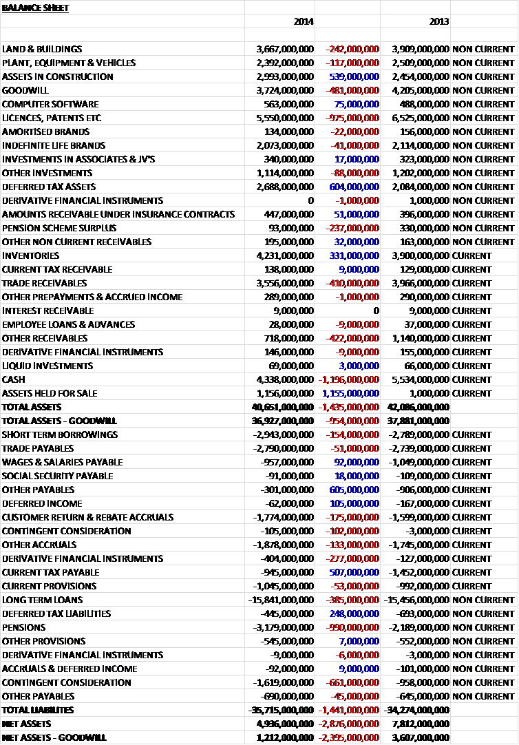 Conversely liabilities increased during the year driven by £990M increase in pension liabilities, a £661M increase in contingent consideration, a £385M increase in loans and a £277M growth in derivative financial instrument liabilities, partially offset by a £605M decline in other payables due to the lack of the £620M payable to non-controlling interests in the Indian subsidiary that was settled during this year, and a £755M decline in tax liabilities. The end result is a net asset (excluding goodwill) level of £1.212BN, a £2.395M collapse when compared to 2013. The group also has £701M of operating lease commitments, £310M of which are on the balance sheet.