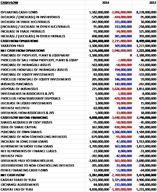 Before movements in working capital, cash profits were £2.696BN lower at £5.582BN. A decrease in receivables and an increase in payables, however, improved this to £6.284BN, a £2.215BN decline from last year and after tax the net cash flow from operations was £5.176BN. In a quirk of fate, the group spent the same amount as last year, £1.188BN, on property, plant and equipment. The group then spent £563M on intangible assets and gained a net cash inflow from the purchase and disposal of businesses so that before financing there was still a fairly healthy cash inflow of £4.098BN. This cash flow just about covered the £3.843BN spent on dividends but could not cover the £707M interest costs and the £679M purchase of non-controlling interests relating to the investment in the Indian subsidiary which meant there was a net cash outflow of £1.287BN. The group still ended the year with £4.028BN of cash, though, so despite losing more than a billion pounds in cash, this was not a total disaster.