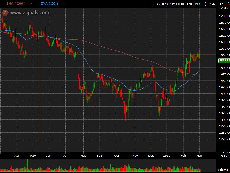 The GSK chart actually looks quite promising. After a decline through much of 2014, the shares have been recovering so far this year with both the share price and the 50 day EMA above the 200 day moving average.