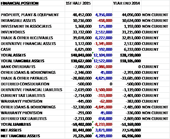 When compared to the end point of last year, total assets at the half year point were some £12.1M higher, driven by a £6.2M increase in receivables, a £4.4M growth in property, plant & equipment and a £2.5M increase in inventories which was partially offset by a £1.3M fall in derivative financial assets. Liabilities also increased during the period due to a £7.1M increase in bank overdrafts, a £4.9M growth in other loans and a £1.5M increase in derivative financial liabilities, somewhat offset by a £4.8M fall in payables to give a net tangible asset level of £71.2M, a healthy £4.3M increase and a very strong balance sheet.