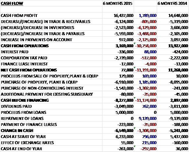 Before movements in working capital, cash profits increased by £1.8M to £16.4M but a huge outflow of working capital meant that cash from operations fell by £10.8M to £3.2M, which after an increased tax bill meant that there was barely any operational cash flow, just £77K.  Clearly this was not enough to cover capital expenditure of £6.9M and a £1.5M purchase of non-controlling interests to give a cash outflow of £8.3M before financing.  £5M of new loans covered the dividends but there was still a £6.5M cash outflow for the year and a negative cash balance of £261K at the end of the year but management expect to see an improvement in the cash flow position by the year end.