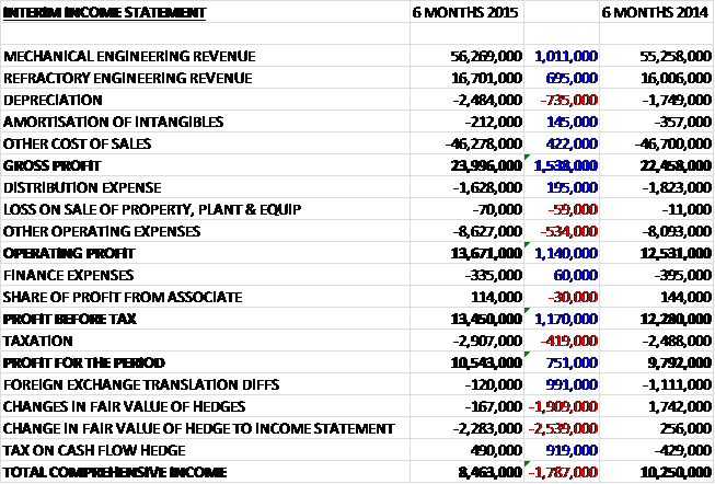 Overall revenues increased year on year driven by increased Pacific Basin and other Europe sales with mechanical engineering up £1M and refractory engineering increasing by £695K.  We then see an increase in depreciation offset by a fall in amortisation and other cost of sales so that gross profit was £1.5M ahead of last time.  A small increase in distribution expenses was then offset by an increase in other operating expenses before a slightly lower finance expense meant that profit before tax increased by £1.2M which reduced to a £751K increase to £10.5M after higher taxation increased year on year.