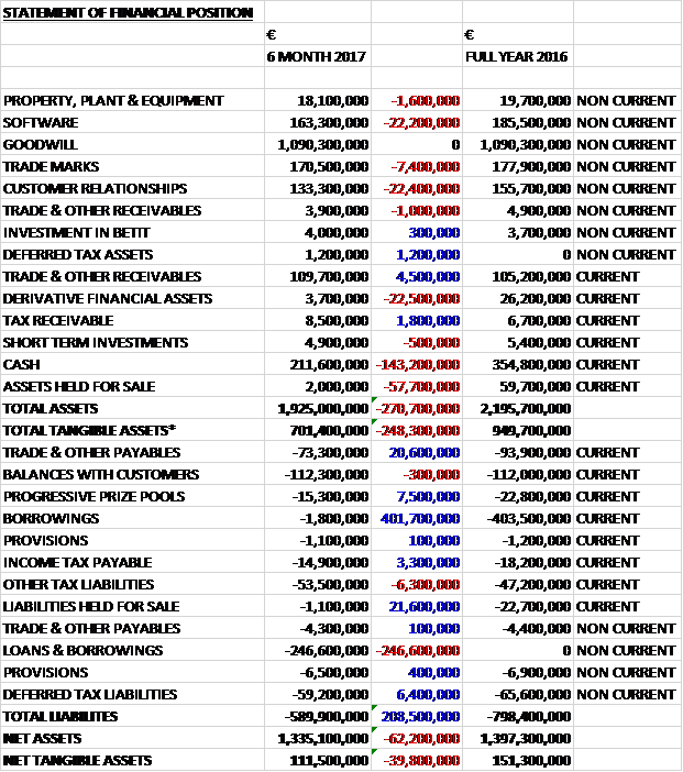 When compared to the end point of last year, total assets declined by €270.7M, driven by a €143.2M decrease in cash, a €57.7M fall in assets held for sale, a €22.5M decline in derivative financial assets, a €22.4M fall in customer relationships, and a €22.2M decrease in software. Total liabilities also decreased during the period due to a €155.1M fall in borrowings, a €20.6M decrease in payables and a €7.5M decrease in the progressive prize pool. The end result was a net tangible asset level of €111.5M, a decline of €39.8M over the past six months.