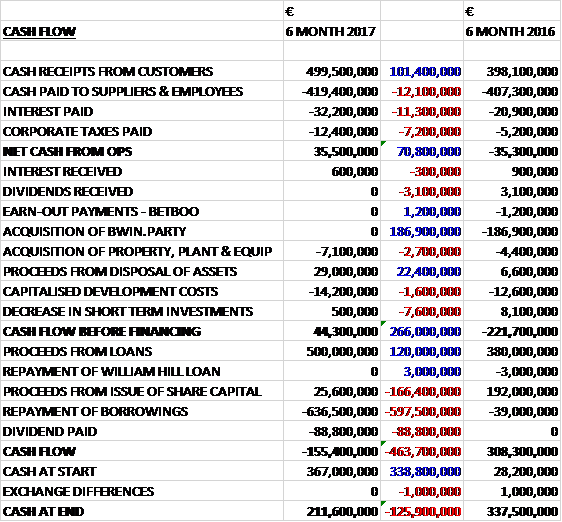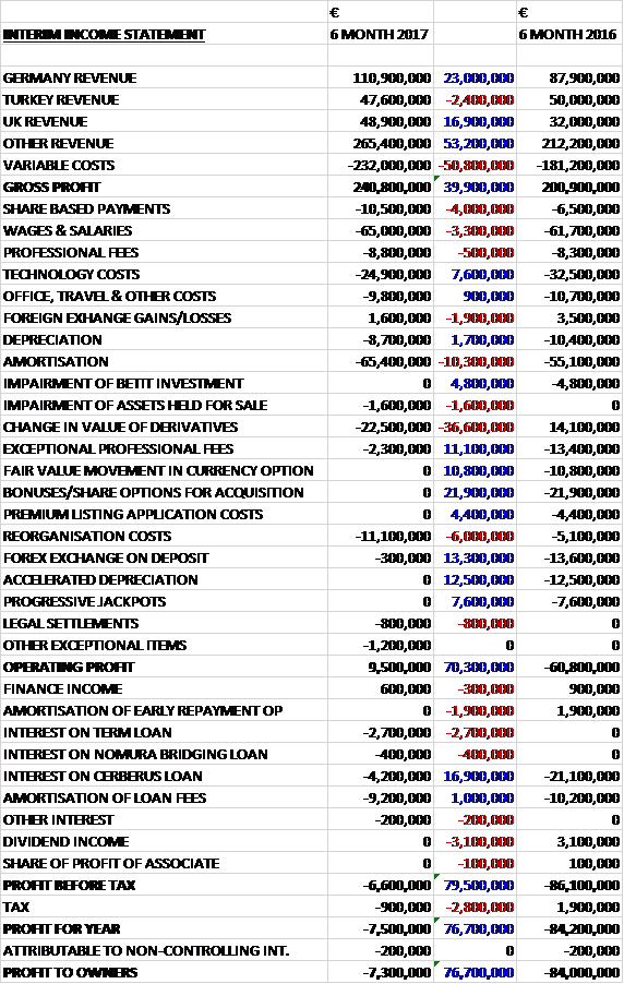 Revenues increased when compared to the first half of last year as a €2.4M decline in Turkish revenue was more than offset by a €23M growth in German revenue, a €16.9M increase in UK revenue and a €53.2M growth in other revenue. Variable costs also increased to give a gross profit €39.9M ahead. The already-substantial share based payments increased by €4M, wages and salaries were up €3.3M and amortisation increased by €10.3M but technology costs declined by €7.6M, no Betit impairment which was €4.8M last time, an €11.1M reduction in professional fees, a €13.3M fall in the cost of forex on the deposit and no fair value movement of the currency option, bonus share options relating to the acquisition, premium listing costs, accelerated depreciation or progressive jackpots. There was a €6M increase in reorganisation costs and a €36.6M detrimental movement in the value of derivatives, however, all of which gave a €70.3M positive swing to an operating profit. The interest on the Cerberus loan fell by €16.9M but there was €2.7M interest on the new term loan and no dividend income, which was €3.1M last time, and after tax charges grew by €2.8M the loss for the period was €7.3M, an improvement of €76.7M year on year.
