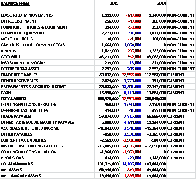 When compared to the end point of last year, total assets fell by £13M driven by a £32.6M decline in trade receivables as a result of efficient working capital management and the timing of invoicing, partially offset by a £13.9M increase in prepayments and accrued income as a result of an increase in accrued income in the Netherlands due to the timing of invoicing, a £3.1M growth in cash, a £1.7M increase in capitalised development costs and a £1.3M growth in other receivables.  Total liabilities also fell during the year as a £4.8M increase in the invoice discounting facilities and a £1.6M growth in current tax liabilities was more than offset by a £7.8M fall in trade payables, a £4.1M decline in other tax and social security payables, a £3.5M decrease in accruals and deferred income and a £2.5M fall in other payables.  The end result is a net tangible asset level of £13.2M, a decline of £1.9M year on year.