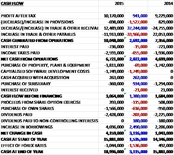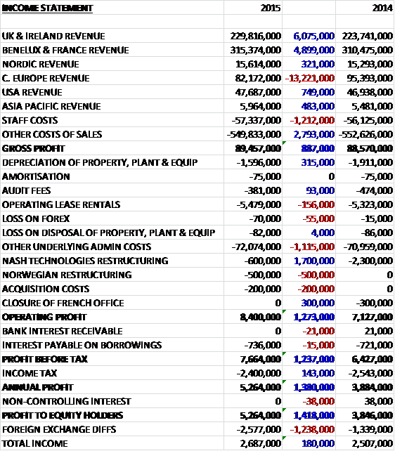 Overall revenues fell when compared to last year as increases in the majority of markets was more than offset by a £13.2M fall in Central European revenue.  Staff costs increased slightly but other cost of sales declined to give a gross profit some £887K ahead.  We then see a slightly lower depreciation but an increase in admin costs before various non-underling costs took their toll, with a £1.7M fall in Nash Technologies restructuring,  partially offset by increases in other costs to give an operating profit £1.2M higher than in 2014.  After slightly higher finance costs were offset by a lower tax charge, the profit for the year came in at £5.3M, an increase of £1.4M year on year.