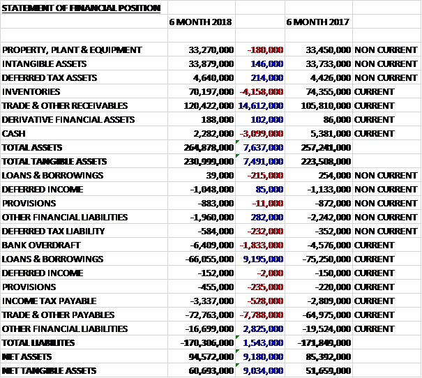 When compared to the end point of last year, total assets increased by £7.6M, driven by a £14.6M growth in receivables, partially offset by a £4.2M decline in inventories and a £3.1M decrease in cash. Total liabilities declined in the period as a £7.8M increase in payables and a £1.8M growth in the overdraft were more than offset by a £9M decline in borrowings and a £3.1M fall in other financial liabilities, mainly relating to finance leases. The end result was a net tangible asset level of £60.7M, a growth of £9M year on year.