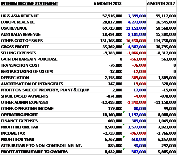 Revenues increased when compared to the first half of last year with an £11.2M increase in US revenue, a £4.3M growth in European revenue, a £3.2M increase in Australian revenue and a £2.4M growth in UK and Asian revenue. Cost of sales also increased to give a gross profit £4.6M higher. Selling expenses were up £1.1M, there was no gain on bargain purchase, which was £563K last time, depreciation was up £389K and other admin expenses grew by £1.3M to give a £1.2M increase in operating profit. Finance expenses reduced by £385K but tax charges grew by £967K which meant that the profit for the period was £6.4M, a growth of £567K year on year.