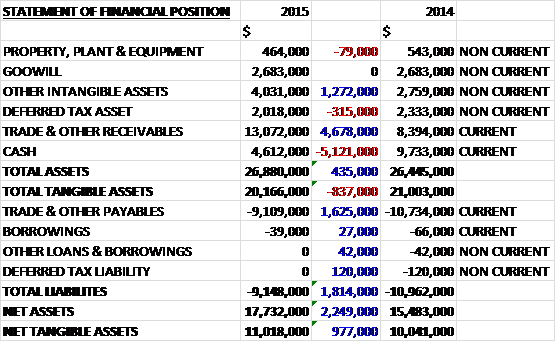 When compared to the endpoint of last year, total assets increased by $435K driven by a $4.7M growth in receivables and a $1.3M increase in other intangible assets, partially offset by a $5.1M decline in cash levels and a $315K fall in the deferred tax assets.   Liabilities fell during the year mainly due to a $1.6M decrease in payables which meant that the net tangible assets were $11M, an increase of $977K year on year.