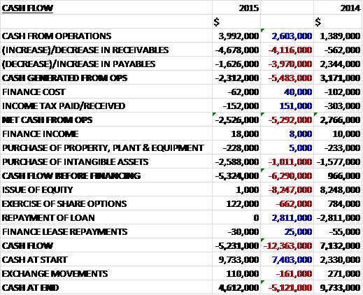 Before movements in working capital, cash profits increased by $2.6M to just under $4M.  Large increases in receivables, apparently as a result of some significant deals closed at the end of the year, and declines in payables meant that there was a net operating cash outflow of $2.5M for the year, a detrimental movement of $5.3M year on year.  The group then spent $2.6M developing intangible assets and $228K on property plant and equipment which meant that the cash outflow before financing items stood at $5.3M.  The group gained a small amount from the exercise of share options, partially offset by some finance lease repayments so that the cash outflow for the year stood at $5.2M to give a cash level of $4.6M at the year-end which is clearly not a sustainable state of affairs.