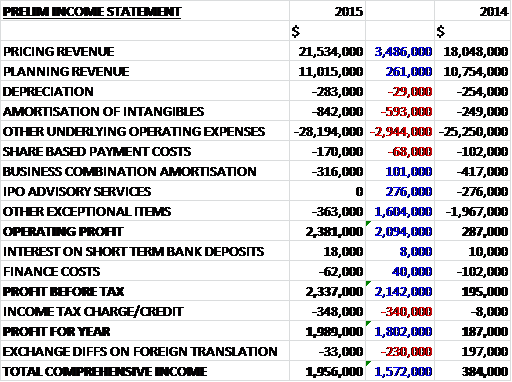 Revenue increased when compared to last year as pricing revenue was up $3.5M and planning revenue grew by $261K.  There was a greater amount of amortisation and other underlying operating expenses were up $2.9M but this year benefited from the lack of $276K worth of IPO advisory services and other exceptional items totalling $2M that occurred last year so, although there as $363K relating to costs from the company’s floatation, including severance pay of $181K to Brad Ormsby.  The operating profit was therefore, some $2.1M higher.  Finance costs fell by $40K but the tax was much higher so that the profit for the year came in at just under $2M, an increase of $1.8M year on year.