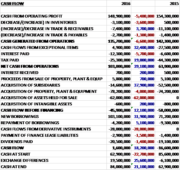 Before movements in working capital, cash profits declined by £5.4M to £148.9M. There was a cash outflow from working capital and interest costs increased by £5.7M. This was offset by a £32.4M positive swing to cash inflows from exceptional items and a £19M reduction in tax payments to give a net cash from operations of £103M, a growth of £39.1M year on year. The group spent a net £72.4M on property, plant and equipment, £14.6M on acquisitions and £62M on acquiring the building at the heart of the contract dispute. This meant that there was a cash outflow of £45.9M before financing. The group therefore took out a net £98.9M of new borrowings but saw a £28M cash outflow from derivative instruments and spent £20.5M on dividends to give a cash flow of £1.6M and a cash level of £84M at the year-end (aided by forex movements).