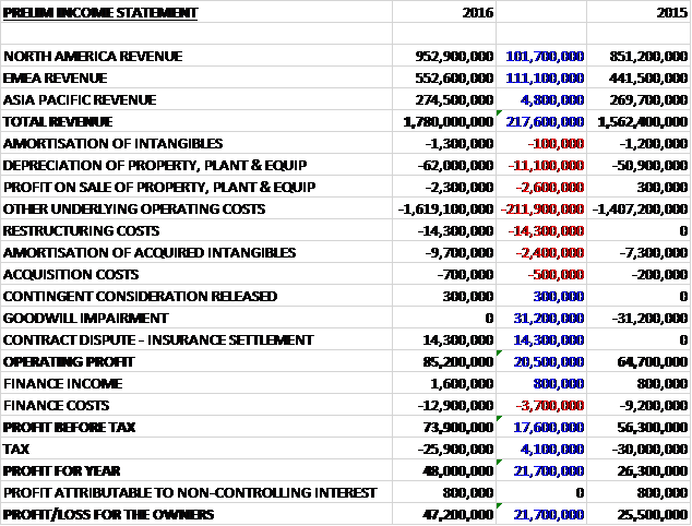 Revenues increased when compared to last year due to a £101.7M growth in North America Revenue, a £111.1M increase in EMEA revenue and a £4.8M growth in Asia Pacific revenue. Depreciation charges grew by £11.1M, there was a £2.3M loss on the sale of property, plant and equipment and other underlying operating costs increased by £211.9M. We also see £14.3M of restructuring costs, a £2.4M growth in amortisation of acquired intangibles and a £500K increase in acquisition costs being offset by the lack of any goodwill impairments which accounted for £31.2M last year and a £14.3M profit relating to the insurance settlement on the contract dispute. This all meant that the operating profit grew by £20.5M. Finance costs increased by £3.7M but tax charges reduced by £4.1M to give a profit for the year of £47.2M, a growth of £21.7M year on year. Excluding the big one-offs, however, and profit fell by £9.5M.