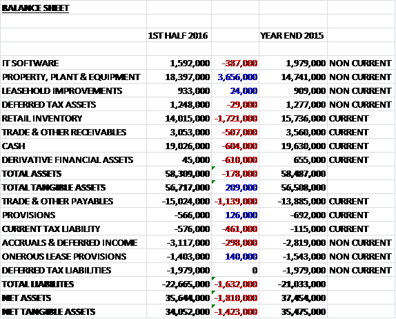 When compared to the end point of last year, total assets fell by £178K driven by a £1.7M decline in retail inventory due to a re-phasing of Autumn/Winter stock intake to better align product availability with customer demand, a £610K fall in the value of the derivative financial asset, a £604K decrease in cash and a £507K fall in payables, partially offset by a £3.7M growth in property, plant and equipment. Total liabilities increased during the period due to a £1.1M growth in payables and a £461K increase in the current tax liability. The end result is a net tangible asset level of £34.1M, a decline of £1.4M over the past six months.