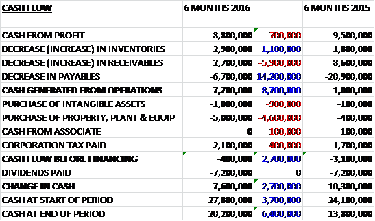 Before movements in working capital, cash profits fell by £700K to £8.8M but a much smaller fall in payables than last year meant that the cash generated from operations was some £8.7M better at £7.7M. The group then spent £1M on intangible assets, £5M on property, plant and equipment, and £2.1M on tax to give a cash outflow of £400K before financing. The dividend payment of £7.2M then meant that the cash outflow for the period was £7.6M to give a cash level of £20.2M.