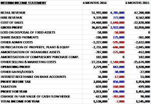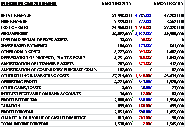 Revenue increased when compared to the first half of last year with a £4.8M growth in retail revenue and a £777K increase in hire revenue. Cost of sales also increased to give a gross profit £3.9M higher. We then see admin costs increase along with a £686K growth in depreciation and a £375K increase in amortisation. This, combined with a £1.5M increase in other selling and marketing costs meant that operating profit grew by £843K when compared to the first half of 2015. After a modest increase in tax, the profit for the period was £2.2M, an increase of £700K year on year.