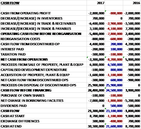 Before movements in working capital, cash losses widened by £800K to £2.8M. There was a further cash outflow from working capital and after reorganisation cost increased by £600K and £4.4M cash inflow from the discontinued operation was taken into account, the net cash outflow from operations was £2.3M, a detrimental movement of £8.2M year on year. The group received £6.8M from the sale of fixed assets and £25.9M from the sale of the discontinued operation and spent £1.6M on property, plant and equipment to give a cash inflow of £28.4M before financing. This was used to pay off £7M of loans to give a cash flow of £21.3M for the year and a cash level of £30.3M at the year-end.