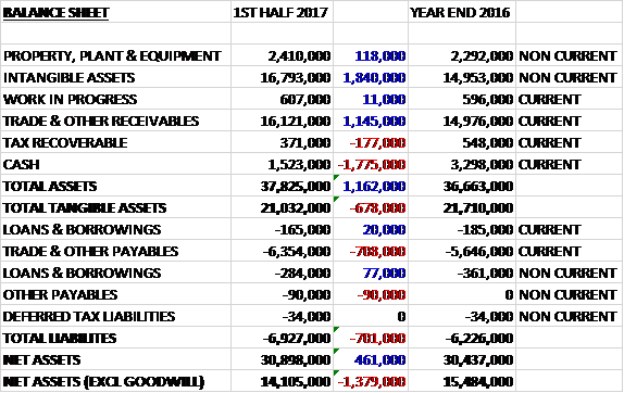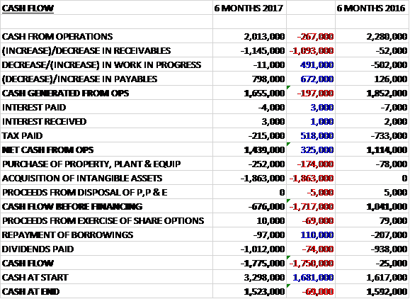 Before movements in working capital, cash profits declined by £267K to £2M. There was a modest cash outflow from working capital but after tax payments declined by £518K the net cash from operations comes in at £1.4M, a growth of £325K year on year. The group spent £1.9M on intangible assets and £252K on property, plant and equipment which meant that before financing there was a cash outflow of £676K. The group also paid out £1M in dividends which meant the cash outflow for the period was £1.8M and the cash level at the period-end was £1.5M.