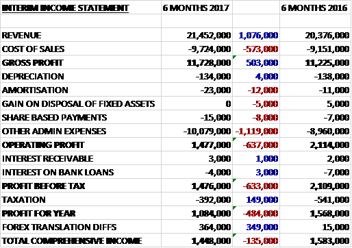 As can be seen the profit declined during the period despite the forex tailwind. This reflects acquisition and integration costs, and additional investment in business development and marketing activities along with slower than expected underlying revenue growth. The professional fees in connection with the acquisition amounted to £57K and the net operating cost of the investment in Nicaragua totalled £216K. Measures have been taken to address the level of admin expenses in the second half of the year including the scale of investment in business development activities.