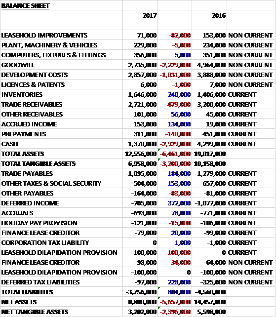When compared to the end point of last year, total assets declined by £6.5M driven by a £2.9M decrease in cash, a £2.2M impairment of goodwill, a £1M impairment of development costs and a £479K fall in trade receivables. Total liabilities also declined, mainly due to a £228K fall in deferred tax liabilities, a £372K decline in deferred income due to lower levels of advance payments from customers and a £184K decrease in trade payables. The end result was a net tangible asset level of £3.2M, a decline of £2.4M year on year.