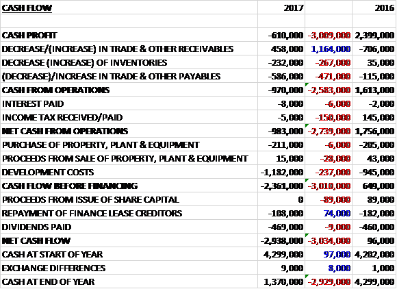 Before movements in working capital, the group saw a £3M swing to tax losses of £610K. There was a small cash outflow from working capital but this was less than last time. There was a £150K fall in tax income, however, which meant that the net cash outflow from operations was £983K, a detrimental movement of £2.7M year on year. The group then spent £1.2M on development costs and £211K on property, plant and equipment to give a cash outflow of £2.4M before financing. They also paid out £469K in dividend and £108K on finance leases to leave a cash outflow for the year of £2.9M and a cash level of £1.4M at the year-end.
