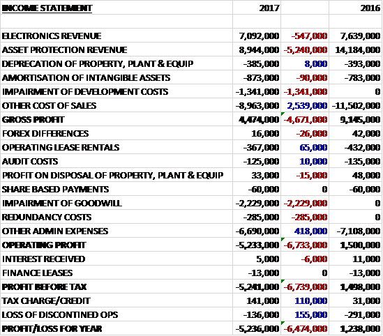 Revenues fell when compared to last year due to a £5.2M decline in asset protection revenue and a £547K decrease in electronics revenue. There was a £1.3M impairment of development costs but other cost of sales decreased by £2.5M which meant that the gross profit was £4.7M lower. We also see a £2.2M impairment of goodwill and redundancy costs of £285K, although other admin expenses decreased by £418K which meant that the operating loss saw a detrimental movement of £6.7M. Finance costs remained broadly the same but the tax credit increased by £110K and the loss from discontinued operations decreased by £136K. All of this meant that the loss for the year came in at £5.2M, a detrimental movement of £6.5M year on year.