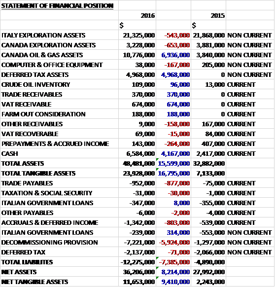When compared to the end point of last year, total assets increased by $15.6M driven by a $6.9M growth in the Canadian oil and gas assets following the Rainbow asset acquisition, a $5M increase in deferred tax assets and a $4.2M growth in cash. Total liabilities also increased due to a $5.9M increase in the decommissioning provision, an $877K growth in trade payables and an $803K increase in accruals and deferred income. The end result was a net tangible asset level of $11.7M, a growth of $9.4M year on year.