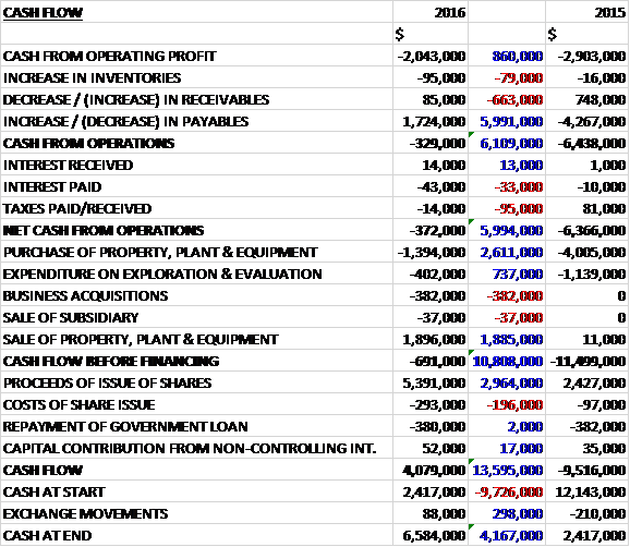 Before movements in working capital, cash losses improved by $860K to $2M. There was a cash inflow from working capital due to an increase in payables which meant that the net cash outflow from operations was $372K, a $6M improvement year on year. The group also spent $1.4M on property, plant and equipment; $402K on exploration and $382K on acquisitions. They did take in $1.9M from the sale of fixed assets, however to give a cash outflow of $691K before financing. The group issued new shares that brought in $5.4M and after share issue costs and $380K repaid on the government loan, there was a cash inflow of $4.1M and a cash level of $6.6M at the year-end.