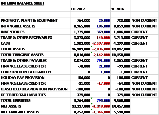 When compared to the end point of last year, total assets declined by £2M driven by a £2.4M reduction in cash, partially offset by a £369K growth in inventories. Total liabilities also declined due to a £791K fall in payables. The end result was a net tangible asset level of £4.3M, a decline of £1.3M over the past six months.