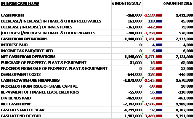 The group spent £644K on development costs and £81K on other capex so that before financing there was a cash outflow of £1.9M. After dividends were paid out too, there was a cash outflow of £2.4M and a cash level of £1.9M at the period-end.