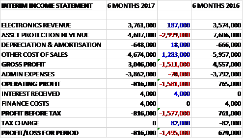 Revenues declined when compared to the first half of last year as a £3M fall in asset protection revenue was only partially offset by a £187K growth in electronics revenue, Cost of sales declined by £1.3M to give a gross profit £1.5M below that of last time. Admin expenses increased by £70K but tax charges declined by £82K to give a loss for the period of £816K, a detrimental movement of £1.5M year on year.