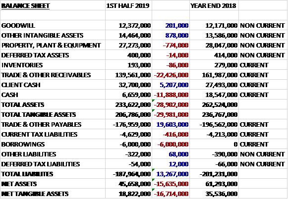 When compared to the end point of last year, total assets declined by £28.9M, driven by a £22.4M decline in receivables and an £11.9M decrease in cash, partially offset by a £5.2M increase in client cash. Total liabilities also declined as a £6M increase in borrowings was more than offset by a £19.6M fall in payables. The end result was a net tangible asset level of £18.8M, a decline of £16.7M over the past six months.