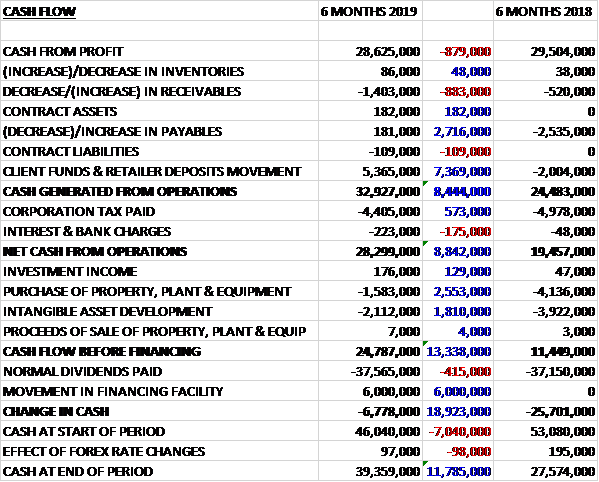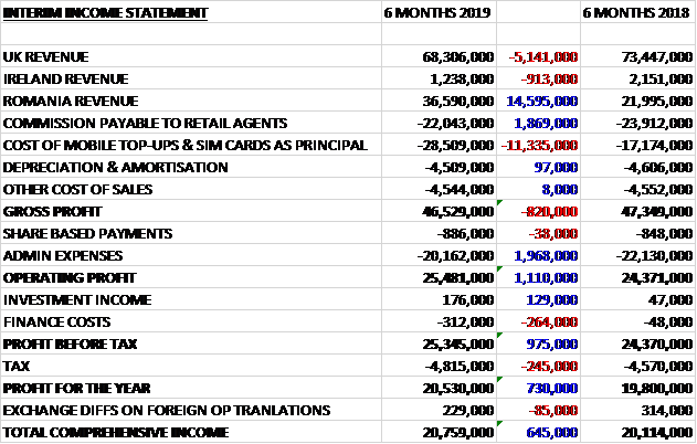 Revenues increased when compared to the first half of last year as a £5.1M decline in UK revenue and a £913K fall in Irish revenue was more than offset by a £14.6M growth in Romanian revenue. Commission payable to retail agents decreased by £1.9M but the cost of mobile top-ups and sim cards as principal increased by £11.3M which meant that the gross profit was down £1.1M. Admin expenses fell by £2M, however, to give an operating profit £1.1M above that of last time. Investment income was up £129K but finance costs increased by £264K and tax charges grew by £245K to give a profit for the period of £20.5M, a growth of £730K year on year.